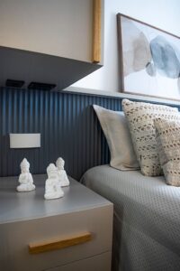 Por ser um quarto com pouco espaço toda marcenaria dos armários foi desenhada pela arquiteta, que optou por cores neutras e claras para contrastar com o azul da cabeceira e personalizou os puxadores em madeira remetendo ao piso em madeira maciça e natural. Acima das mesas de cabeceira foram colocados armários aéreos para aproveitamento de espaço, e sob eles foram instalados pontos elétricos e interruptores ficando escondidos e sem intervenção na decoração.