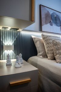 Por ser um quarto com pouco espaço toda marcenaria dos armários foi desenhada pela arquiteta, que optou por cores neutras e claras para contrastar com o azul da cabeceira e personalizou os puxadores em madeira remetendo ao piso em madeira maciça e natural. Acima das mesas de cabeceira foram colocados armários aéreos para aproveitamento de espaço, e sob eles foram instalados pontos elétricos e interruptores ficando escondidos e sem intervenção na decoração.