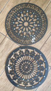 Lembrando que as cores representam os Chakras (pontos de energia) do corpo humano, a artista plástica Silvana Chiodi, de Artur Nogueira, também optou pelo MDF para suas alegres mandalas. Na versão pendente, Silvana criou peças com duas mandalas unidos por macramê. O barbante grosso entrelaçado também é usado para permitir que elas fiquem suspensas, e na franja de finalização para oferecer maior leveza. Silvana foi bem eclética na escolha das cores. Ora ela mescla o marrom com um composée de azul para destacar os círculos dos demais desenhos de cada peça, ora ela brinca com os desenhos que remetem às pétalas de flores e os colore com cores vibrantes, como o amarelo, o laranja, o roxo, o azul e o verde. Na forma de quadros, suas mandalas remetem a azulejos decorativos, em busca de outros pares para serem complementados. É a sensação de continuidade. Para os quadros, ela escolheu o contraste do marrom com o amarelo e do cinza com o branco.
