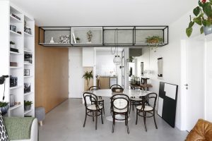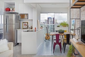 As cadeiras coloridas, mas com o mesmo design, dão um toque de modernidade e alegria ao pequeno apartamento de 35 m² projetado pelo escritório Oliva Arquitetura | Foto: Julia Ribeiro