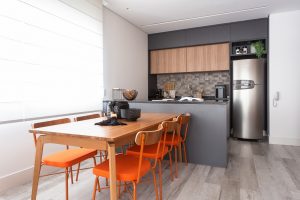 As cadeiras com assento e estrutura laranja ajudam a realçar o amadeirado claro da mesa e são destaque em meio ao cinza predominante na decoração da cozinha | Projeto: Studio Tan-gram | Foto: Estúdio São Paulo