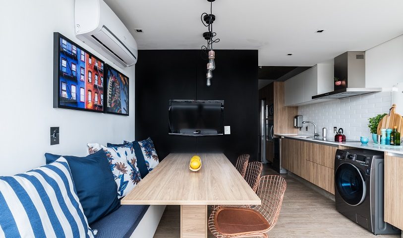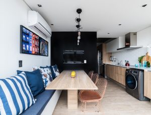 “A principal vantagem dessa tendência é economizar espaço, ganhando circulação no cômodo”, conta Júlia Guadix. Sendo assim, o canto alemão precisa de, no mínimo, 45 a 50 cm de profundidade em comparação aos 70 cm de um conjunto comum, quando usamos cadeiras.