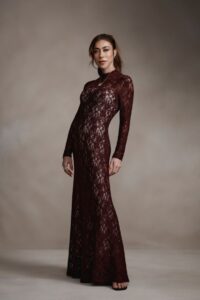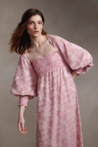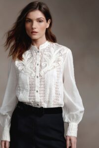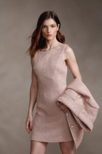 As modelagens priorizam fluidez e movimento, com vestidos e conjuntos de caimento leve, enquanto a alfaiataria surge em uma abordagem mais descontraída. Materiais como chiffon, devorê, tweed e seda reforçam o contraste entre delicadeza e presença, ao lado de trabalhos manuais que evidenciam o cuidado nos detalhes, como rendas aplicadas e bordados feitos à mão.