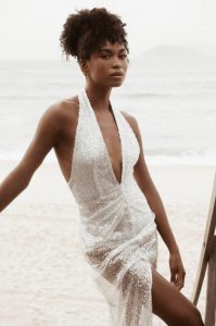 Dentre as 18 peças desta collab, é possível destacar o vestido longo e prata de paetê, os conjuntos de biquínis tanga e cortininha, o pareô e a pantalona.