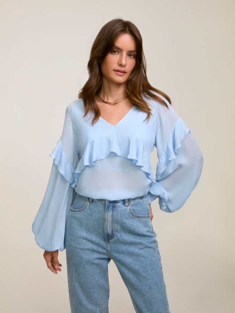 O azul sempre faz parte do verão europeu como grande protagonista e chega nessa temporada com um ar mais leve e um tom mais claro. Combinado com uma paleta fresh que é a cara da estação, com off-white e branco, o azul claro aparece para dar cor a camisas, blusas e saias amplas, garantindo movimento suave na composição.