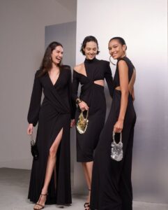 Eventos noturnos trazem um all black contemporâneo e com toque sexy e elegante. Tanto em vestidos quanto em conjuntos de tops e saias, o full look preto do verão acompanha cut-outs em seu design, valorizando as curvas naturais do corpo. Com essa base neutra, é possível brincar com acessórios maxi para agregar personalidade ao visual.