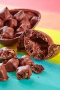 A casca com chocolate meio amargo(50% cacau) é recheada com Nougat, feito à mão, extremamente macio e dono de um aroma, indescritível, de mel orgânico, a ele são acrescidos pistaches e pedaços de amêndoas, que garantem crocância e um sabor, extremamente, sofisticado.
