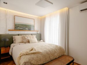 A suíte máster fica voltada para a fachada principal, com uma generosa janela de correr. No banho máster trouxemos o ladrilho hidráulico no tom rosa e o cimento queimado, com o toque artesanal e rústico. Nesse ambiente a ventilação e iluminação acontecem através da zenital.
