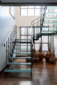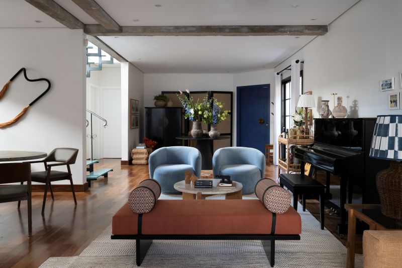 Com 250 m2 e pé-direito generoso de 3,30 m, a residência preserva elementos estruturais marcantes — como as vigas de concreto aparente e a escada original — assumidos como parte essencial da identidade do projeto. O concreto, longe de ser neutralizado, dialoga com materiais quentes, texturas naturais e um mobiliário cuidadosamente selecionado, criando uma atmosfera de conforto, permanência e sofisticação artesanal, com influências do contemporâneo brasileiro e do Mid-Century Modern.