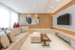 Buscando um design atemporal, as profissionais apostaram em tons neutros com acabamentos clássicos, como porcelanato marmorizado e madeira. A integração também é um dos destaques do projeto, que unificou a sala de estar, a sala de jantar e a área gourmet. Os pontos altos ficam por conta da lareira dupla embutida, que garante o aconchego na hora reunir a família na sala; da mesa de jantar, desenhada especialmente para o projeto e ideal para um almoço mais elaborado; e do pendente de led sobre a mesma, que quebra a simeteria e confere um toque moderno ao ambiente.
