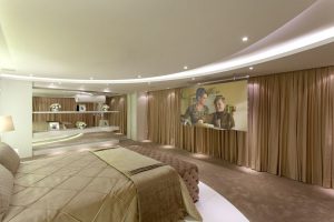 A suíte máster do jogador é completa, com closet e sala de banho. O destaque fica por conta do tablado elevado onde está localizada toda a estrutura da cama. O ambiente dá acesso a um terraço ambientado com sofá e ombrelone, onde é possível desfrutar a vista do condomínio. A área de banho é praticamente um spa, com cascata, cromoterapia, sauna e um pequeno jardim de inverno.