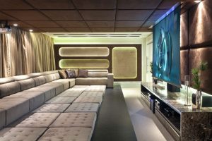O home theater, super tecnológico, é uma verdadeira sala de cinema, com 58 m² que acomodam confortavelmente 40 pessoas. A decoração é composta por sofás, nichos e painéis com iluminação embutida e bancada em mármore.