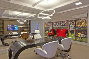 Como ele já tinha uma casa construída, coube ao escritório do arquiteto desenvolver um retrofit, ou seja, promover uma grande repaginada na estrutura já existente. Isso incluiu a colocação de alguns elementos na fachada, a elaboração completa de todo o projeto de design de interiores e a construção de uma área de lazer, incluindo espaço gourmet e uma nova piscina em formato orgânico. O imóvel foi entregue ao jogador prontinho, incluindo a compra de louças e a organização de armários.