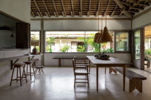 A primeira delas, é uma casa espraiada entre o oceano azul-turquesa e um maciço verdejante de Trancoso. O imóvel que pertence ao estilista Serge Cajfinger, criador da marca francesa Paule Ka, foi projetado por Marcio Kogan e a equipe do Studio MK27, e enfatiza a vivência da natureza com materiais naturais harmonicamente acompanhados por cerâmicas, telas, esculturas e um mobiliário dos anos 1950 e 1960.
