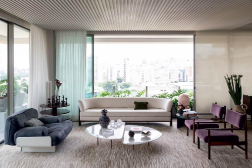 A arquiteta Flávia Gerab El Tayar revela seu lar, um apartamento de 330 m² em que vive com a família em São Paulo. Na busca por um projeto original, ela questionou padrões e elegeu texturas, formas e materiais que aguçam a sensorialidade. A linha de chegada é um apartamento autêntico, nitidamente decorado por uma “apaixonada por móveis, texturas e acabamentos”, como ela mesma se descreve. Sobre a base off-white, com doses de roxo e nuances terrosas, cada objeto parece ocupar seu lugar ideal. Mas não conclua que este é um cenário hermético. No living, a ideia é receber amigos e manter as crianças perto. Se for preciso privacidade, o cantinho curinga se fecha com portas-camarão. “Somos informais. Meus filhos dão cambalhotas no sofá italiano”, conta. Derivam deste jeito leve as decisões sobre praticidade, conforto e durabilidade, como adotar a madeira para revestir superfícies. No teto da área social, a geometria das ripas preenche o forro e camufla a presença de spots embutidos. Aliam-se à iluminação abajures, arandelas e o inconfundível pendente de Serge Mouille na sala de jantar