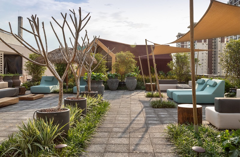 Para isso, a dupla optou por projetar o ambiente com diversos lounges, alternando áreas abertas e outras com coberturas perfuradas (Vari) que ainda permitem a passagem do sol. Todo o mobiliário (Hio Móveis) é pensado para área externa, composto por sofás e chaises de tecido impermeável de alta performance, que permite que resistam às intempéries. Eles foram combinados com mesas de centro de madeira maciça Pequiá e toras de Itaúba (Arboreal) e ombrelone (Tidelli) de palha sintética da Palmex, capaz de trazer rusticidade unida com inovação, uma vez que o material é mais resistente, inclusive ao fogo. “Por serem leves e feitos de espuma, os mobiliários permitem mobilidade e flexibilidade de layout”, diz a dupla.