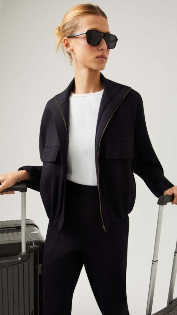 Se a sua preferência é pelo clássico absoluto, as opções em preto total oferecem uma estética minimalista e sofisticada. O conjunto preto, aliado a acessórios estratégicos como fones de ouvido e óculos escuros, é a definição do “perfect aerolook”. É a escolha ideal para quem deseja versatilidade, permitindo que as peças sejam usadas separadamente em diferentes momentos da viagem.