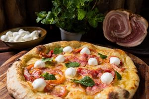 PIZZA DE PANCETA, BÚFALA E HORTELÃ