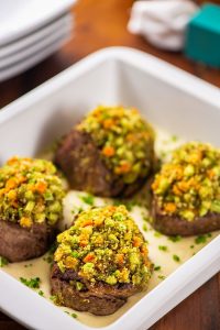 -Filet mignon grelhado em crosta de legumes crocantes ao molho de queijo brie com batatas coradas ao alecrim – R$ 125,00 (700g / serve 2 pessoas)