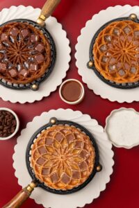 Redondos e generosos, os waffles — disponíveis em versões salgadas e doces — rendem homenagem à rosácea medieval da Catedral de Notre-Dame, um delicado trabalho rendado de luz e cor.