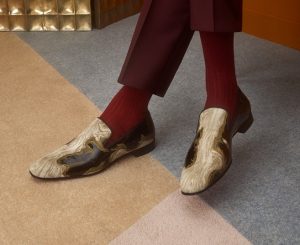Os flats masculinos também apresentam conceitos novos, como uma uma estampa felina no modelo Pony Miaou e um tema geométrico revestindo o Chinchinodou. Eles enganam o olhar com efeitos gráficos hipnóticos e o seduzem com seus detalhes suntuosos.