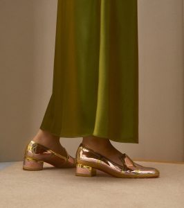 O mote central da coleção é “mix and match!”, pois nela as cores, formas e texturas são compostas de maneira altamente decorativa. Botas e scarpins refletem o produto de uma experimentação otimista com tons ousados e silhuetas afiadas. Na icônica bolsa Paloma, um tecido jacquard exclusivo, batizado tissu géometrique, ostenta linhas geométricas e uma paleta selvagem de nuances, enquanto o modelo Rubylou é reinterpretado em um patchwork de três tons de couro (vinho, preto e dourado) cortados a laser para criar um efeito de trabalho em renda. As novas peças demonstram que não existem limites no processo de criação.