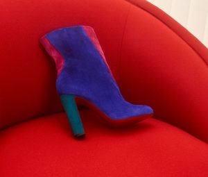 Fluindo através da coleção, a sagacidade de Christian acrescenta um toque de bom humor à temporada. O modelo bicolor Botty Double é um ótimo exemplo: com um corte reto, cada bota é adornada com a forma contrastante da panturrilha de uma mulher, como se pudesse ser vista através do tecido.