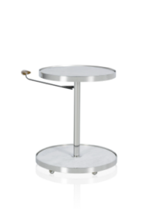 Mesa de apoio One – a coleção One recebe seu nome em referência à unidade. Sua construção versátil permite seu uso como mesa de apoio ou bar, com dois tampos para suporte. Equipada com rodízios e uma alça para facilitar a mobilidade, é um produto funcional.