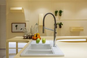 Dentro das caixas a marcenaria define a cozinha conceitual com a Cuba dupla de sobrepor com tábua multiuso em louça branca L.1670.R.17 e a Torneira de mesa para cozinha Deca Colore no acabamento cromado com fendi 1189.C.FD. Apesar da robustez e imponência das peças, a escolha dos materiais e tonalidades imprime uma suavidade acolhedora. No lounge, com uma bancada que traz um desenho mais orgânico, a estética e funcionalidade da Cuba de apoio redonda Slim Branca L.12040.17 e do Monocomando de mesa bica alta para lavatório Lk cromado 2885.C17 ajudam a dar o tom poético, com o objetivo central de gerar sensações.