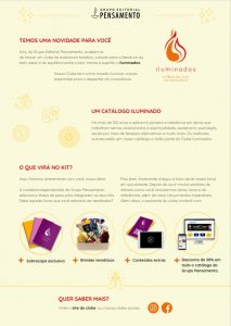 Com mais de um século de história, a editora é pioneira na publicação de obras que trabalham temas relacionados a esses segmentos. Imbuído da missão de oferecer uma experiência completa, o “Iluminados” envia mensalmente à casa do assinante um livro de referência – seja um livro raro e difícil de encontrar ou um lançamento – de temas como esoterismo, espiritualidade, autoajuda, psicologia, sabedoria oriental e saúde com terapias alternativas. As assinaturas começarão em maio e os primeiros kits chegarão aos participantes em junho.