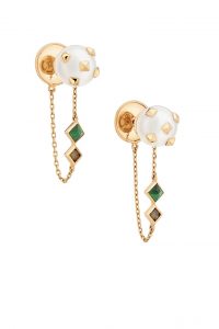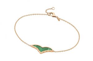 Cada peça tem seu destaque, uma “bossa” particular e encantadora. Intervenções com pequenos spikes em pérolas brancas contrapostas com diamante chocolate em lapidação brilhante compõem itens especiais. O pássaro dá vida à gargantilha e ao anel em malaquita lapidada, um par de peças leves e fáceis de usar. O ouro rosé é a grande estrela dos metais, tornando a joia extremamente usável para o dia e interessante para a noite.