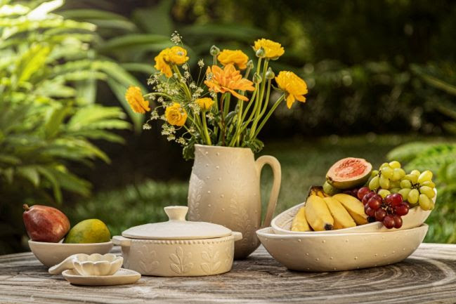 A linha exclusiva reúne 25 peças de cerâmica, entre itens utilitários e de decoração, como filtro de água, jarra, moringa, travessas, prato para bolo, caçarola, mini colher, açucareiro, farinheira, manteigueira, tábua de servir, porta copos, molheira, comedouro de passarinho, cachepô, móbile de flor e prato decorativo.