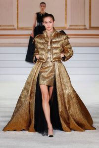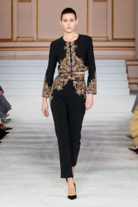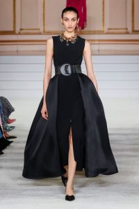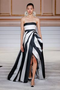 Vestidos com decotes de retrato e dobras espirais românticas colocam a mulher Carolina Herrera no centro das atenções, conquistando a corte. A paleta de cores vivas em tons de joias é baseada em texturas suntuosas de veludo e tafetá em preto, dourado em bordados dourados. As listras geométricas ocupam o centro das atenções em uma miríade de construções meticulosas, separações de malha e drapeados.