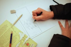 As ações aconteceram em julho e foram parte da colônia de férias da Gibiteca de Curitiba. “Eu fiz a aula de quadrinhos, em que ensinei algumas técnicas de narrativa e de linguagem de quadrinhos. A Michelle, que é xilogravurista, ministrou a oficina de carimbo com as crianças. Elas aprenderam uma a uma a desenhar, recortar, montar e colar um EVA sobre uma base de madeira. Elas faziam um carimbos e daí com tintas faziam desenhos”, conta Irapuan.
