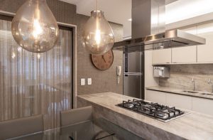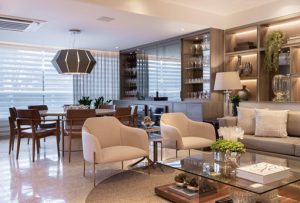 Clássica, a sala de jantar é marcada pelo contraste entre o tom do Lacca Corda, que harmoniza com a luminária Murano branca e contrasta com as colorações cinza e marrom das cadeiras. O mesmo acabamento é utilizado no home theater, que confere um brilho especial ao ambiente que conta ainda com diferentes texturas. Já os laminatos Canaletto, Bianco Nebbia e Kashmir trazem ar clean à cozinha marcada pelos tons terrosos dos revestimentos.