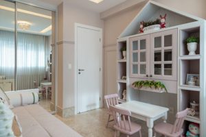 Na suíte do casal, móveis e painel no neutro Lacca Bianco conferem liberdade para a escolha de roupas de cama mais coloridas. O quarto da menina traz a ludicidade de uma casinha de bonecas, onde os acabamentos laminato Bianco Nebbia, Bianco Provenzale e Lacca Molti Colori dão um ar mais delicado, apreciado por muitas meninas.