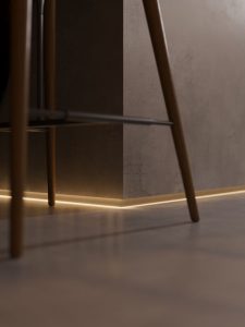 A grande sacada dos rodapés invertidos da coleção é o design das barras exclusivo para essa finalidade, colocando um fim às improvisações. Além da base para encaixe ao fundo do recorte da parede, este rodapé possui uma pequena projeção frontal de forma a criar duas cavidades, uma para receber fitas de LED e a outra para o encaixe na parede, protegendo a extremidade dela.