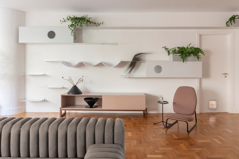 O ponto em comum entre as duas diferentes personalidades está no amor entre eles e aos animais que foram somados à essa família tão diversa. Já no primeiro contato, os clientes falaram sobre o interesse em “gatificar” o apartamento e as arquitetas conseguiram elaborar um projeto que atendesse a todos, tanto em nível de função quanto de estética.