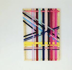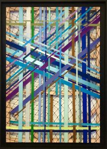Instigada a dar continuidade ao processo e trazer essa obra para dentro das casas, ela criou a série “Bordados”, em que as fitas e a rede foram instaladas em chassis de madeira, tornando-se uma “escultura de parede”.