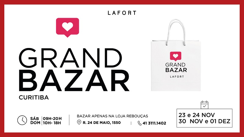 Todos os anos, a marca curitibana, que é referência em tricot e alfaiataria, abre as portas da sua loja do Rebouças para realizar o seu tradicional Grand Bazar. Neste ano, o evento acontece nos finais de semana dos dias 23, 24, 30 de Novembro e 01 de Dezembro e reúne milhares de peças das coleções anteriores da Lafort com descontos imperdíveis. Os preços partem de R$59 com uma grade de tamanhos ampla, que vai do PP ao GG. Essa será a maior edição, em quantidade de peças, que a marca já fez até então.