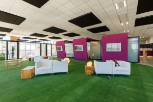 As possibilidades variam de acordo com a linguagem possível dentro da identidade visual da marca, e variam entre usar algo mais abstrato em pintura, painéis ou elementos decorativos, até a parte de iluminação e criação de uma atmosfera, com iluminação em neon, por exemplo. Se a logomarca da empresa em questão é verde e cinza, posso aplicar essas cores na nuvem acústica, na iluminação, no tapete, nos móveis e elementos centrais de ambientes.