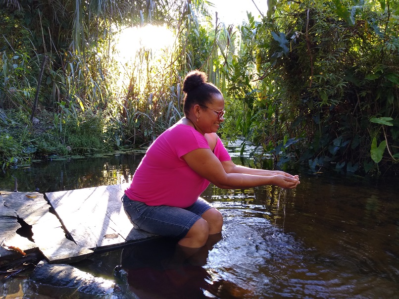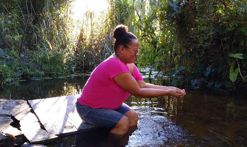 crédito foto: Maria festeja o trabalho de recuperação da nascente da Prata /Foto: Acervo Bracell