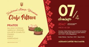 Pontos de venda: Clube Poltava (sábado, das 13h às 18h) e Secretaria da Catedral Ucraniana de São João Batista (Rua Maranhão, 1094, Água Verde);