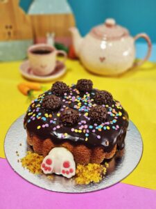 E, para quem deseja uma explosão de sabores, vale encomendar o Bolo Vulcão de Cenoura, com decoração especial de Páscoa e patinhas do coelho tentando entrar nesse vulcão de chocolate.