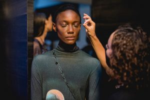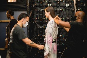 Essa movimentação é bem diferente de outros tempos, pré-pandemia. As equipes são reduzidas e todos os cuidados necessários são tomados. A começar pelo exame de PCR para confirmar que nenhum envolvido no projeto está com coronavírus. Já no set, o uso de máscaras é obrigatório o tempo inteiro. Os modelos só tiram para desfilar e depois já colocam novamente. “É muito bom trabalhar com marcas que se preocupam com a saúde de todos, você se sente mais seguro e respira aliviado durante o job”, diz Bléia Campos.