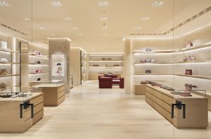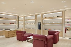 O ambiente é destacado por elegantes pontos de iluminação que percorrem os perímetros do espaço, regando as paredes com luz para realçar as variações artesanais de suas texturas e materiais. Móveis da coleção Bottega Veneta Home são usados na área de calçados, com peças da família modernista Tassello, em vermelho Ribes. Eles também complementam novos displays de exibição confeccionados em madeira de carvalho pálida em tons naturais.
