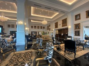 Lobby do The Equestrian Hotel tem lustres de cristal e quadros de artistas locais. (Foto: Divulgação)