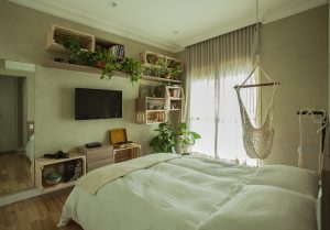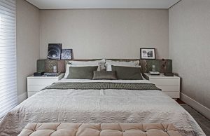 Duas opções de suítes projetadas por Karina Korn com o palha como principal tonalidade: com essência moderna, o dormitório à direita contou com a força da natureza, evocando a tendência do Urban Jungle |Fotos: Eduardo Pozella