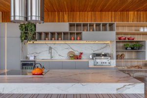 O espaço Varanda Oásis, criado pelo escritório RYSC Arquitetura, combina o melhor do paisagismo com um espaço gourmet sofisticado e funcional. A escolha de Dekton® Reverie para a bancada e a ilha da cozinha traduz a essência do projeto: uma reinterpretação contemporânea da pedra Paonazzo, com veios que mesclam tons de cinza, creme e terracota. Esse toque elegante foi realizado pela marmoraria Sahara, destacando o equilíbrio entre forma e função.