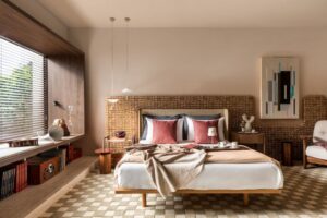 A grande evidência da marca neste ano está no “Quarto Pequenas Pausas”, estreia da arquiteta Talita Nogueira na CASACOR Paraná. Um espaço de 25 m² pensado como refúgio íntimo para o casal, onde arte, memórias e acolhimento ganham forma por meio de materiais naturais, paleta terrosa e uma ambientação que convida à contemplação.